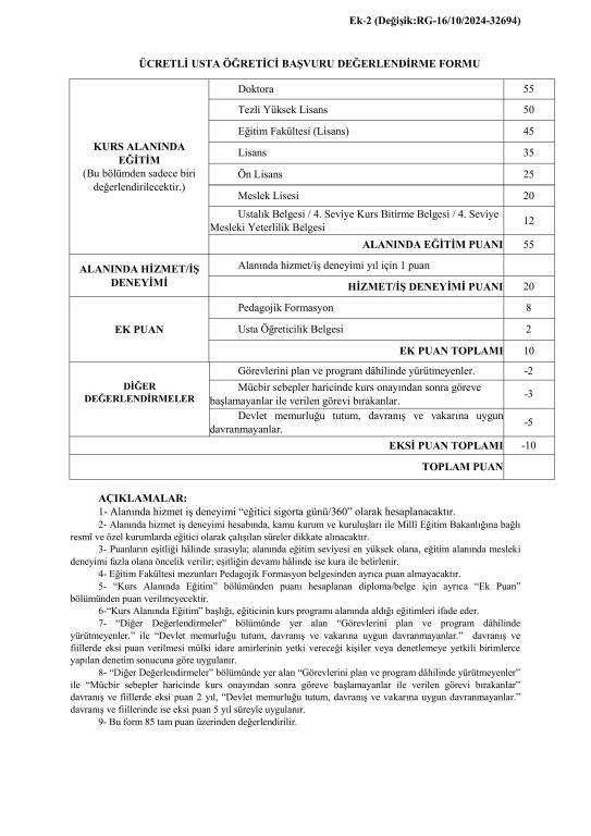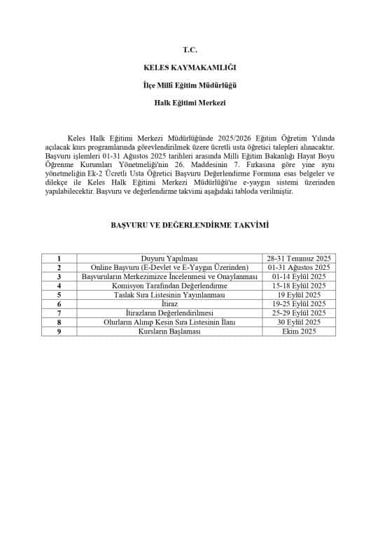 Keles Halk Eğitimi Merkezi Müdürlüğünde 2025/2026 Eğitim Öğretim Yılında açılacak kurs programlarında görevlendirilmek üzere ücretli usta öğretici talepleri alınacaktır. Başvuru işlemleri 01-31 Ağustos 2025 tarihleri arasında Milli Eğitim Bakanlığı Hayat Boyu Öğrenme Kurumları Yönetmeliği'nin 26. Maddesinin 7. Fırkasına göre yine aynı yönetmeliğin Ek-2 Ücretli Usta Öğretici Başvuru Değerlendirme Formuna esas belgeler ve dilekçe ile Keles Halk Eğitimi Merkezi Müdürlüğü'ne e-yaygın sistemi üzerinden yapılabilecektir. Başvuru ve değerlendirme takvimi aşağıdaki tabloda verilmiştir.